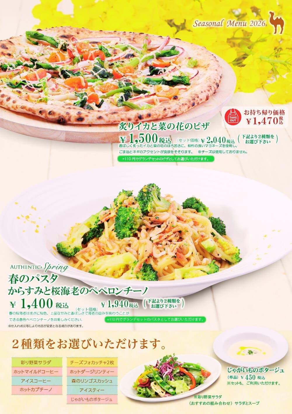 | 2026-01-28 季節のおすすめメニューのご案内です。 | 春を待ちわびる北海道に、ひと足早い季節の味わいをお届けします。香ばしく炙ったイカと、ほろ苦い菜の花をマヨネーズでまろやかにまとめ、ごま油とネギのアクセントを効かせた"炙りイカと菜の花ピザ"。寒さの残るこの時期に、春の訪れを感じさせる一枚です。 食後のデザートには、旬の苺をたっぷり使った期間限定スイーツを。濃厚なソフトクリームに、さっぱりとした苺のジェラートとゼリー、みずみずしい苺を重ねた、ひと足早い春を感じる"いちごパフェ"をご用意しました。春待ちのひとときを、甘やかな余韻とともにお楽しみください。 |